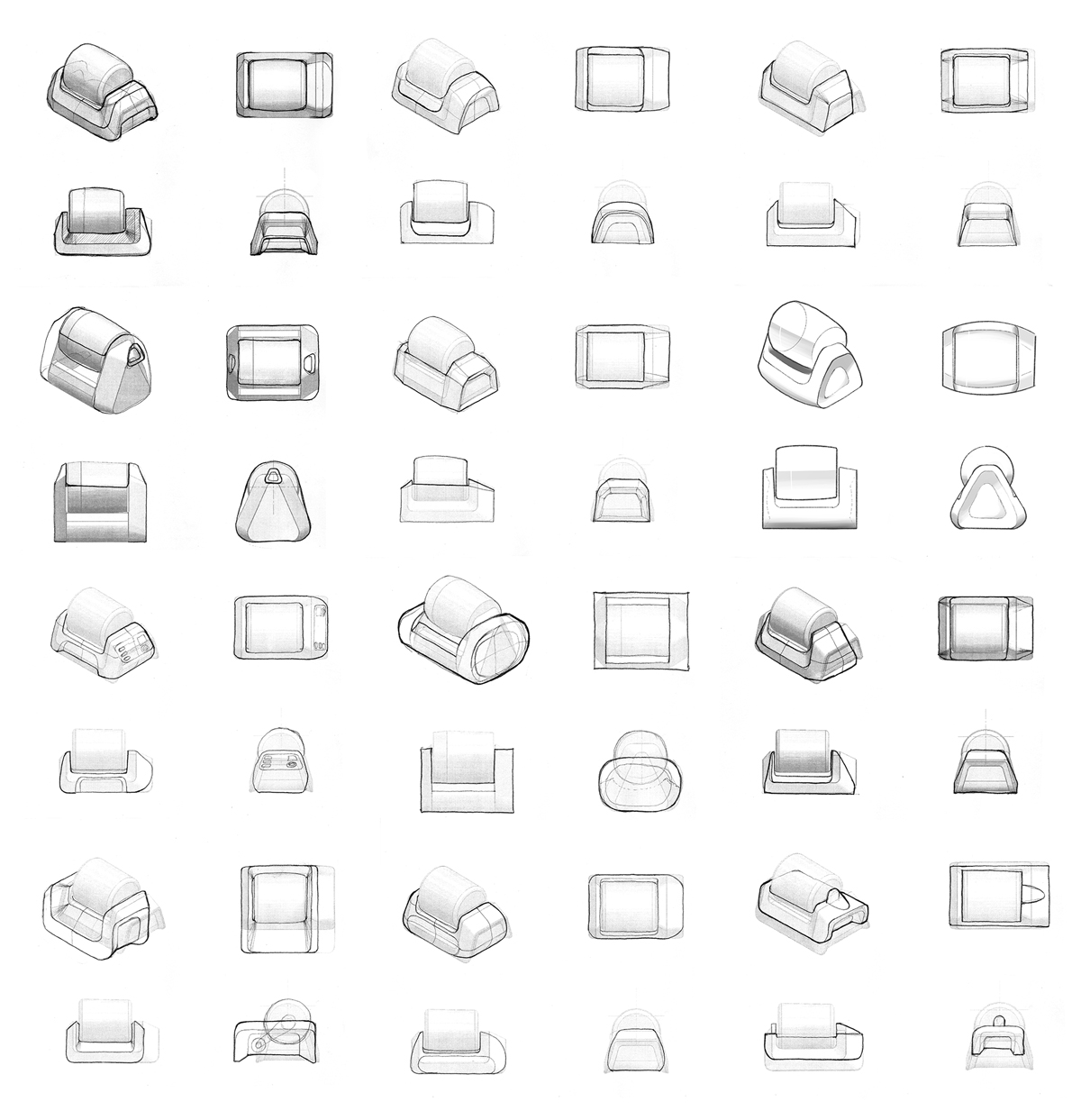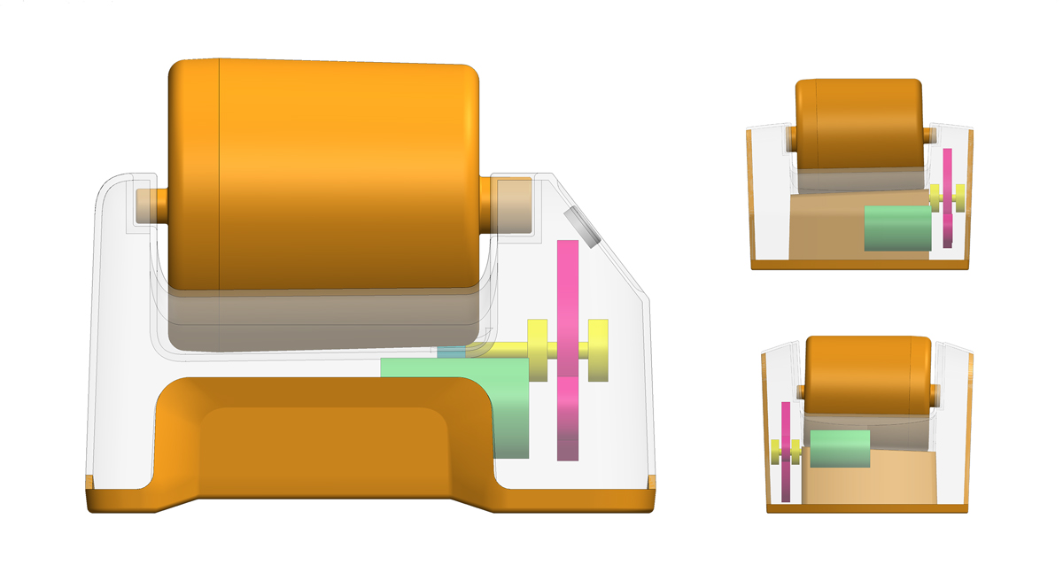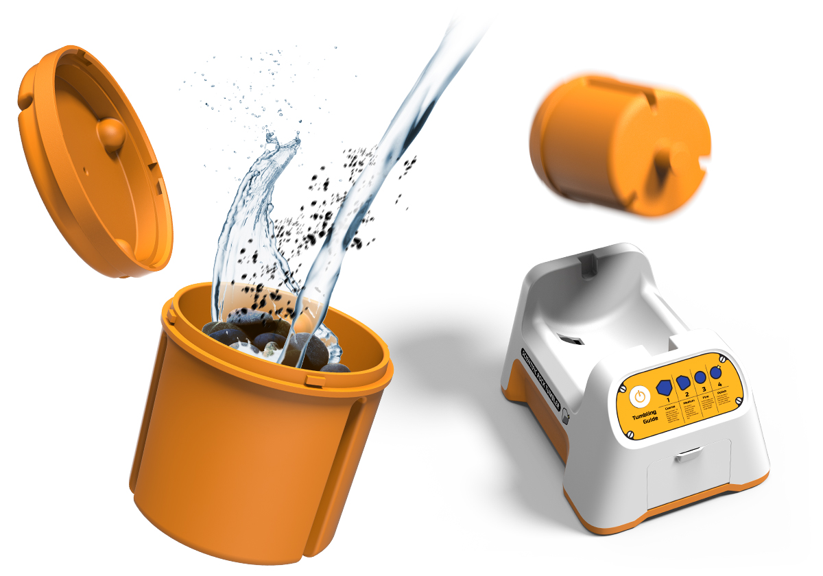 After establishing a basic mechanical plan, we ideated many form possibilities for the housing. Building upon the existing Discovery design aesthetic, we developed a clean, futuristic shape with a stable and grounded presence. The design also presents the user with a helpful polishing guide on the product, just above a drawer useful for storing abrasive media. A TPE rubber ring around the lip of the polishing drum serves dual purpose to both seal the inner chamber and make grippy contact with the drive wheel. Ribs formed into the drum agitate the contents and are easy to injection mold. The final design is a solid addition to the Mindblown product family, supporting STEM interest and demonstrating the amazing erosive forces that shape our world.