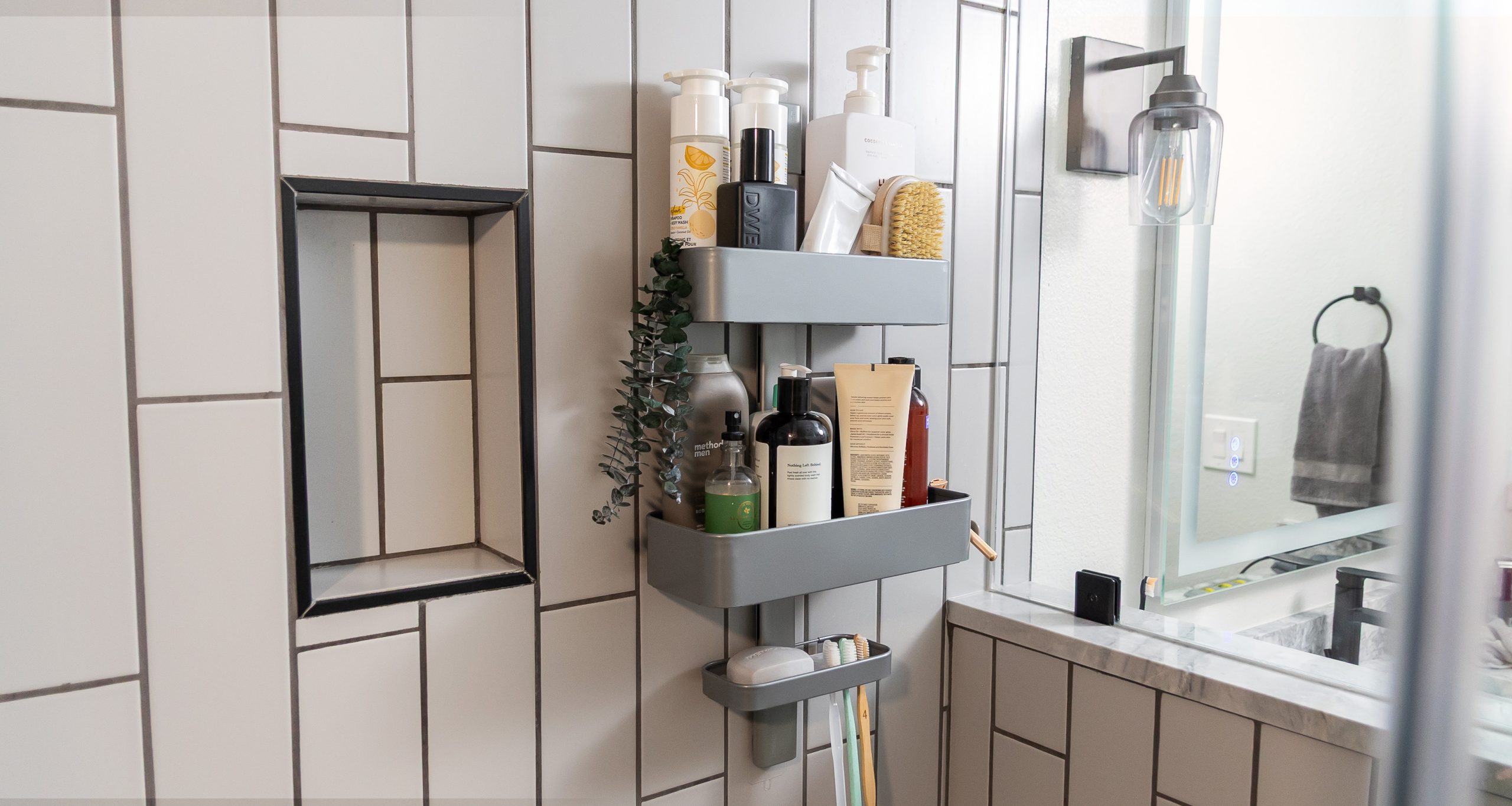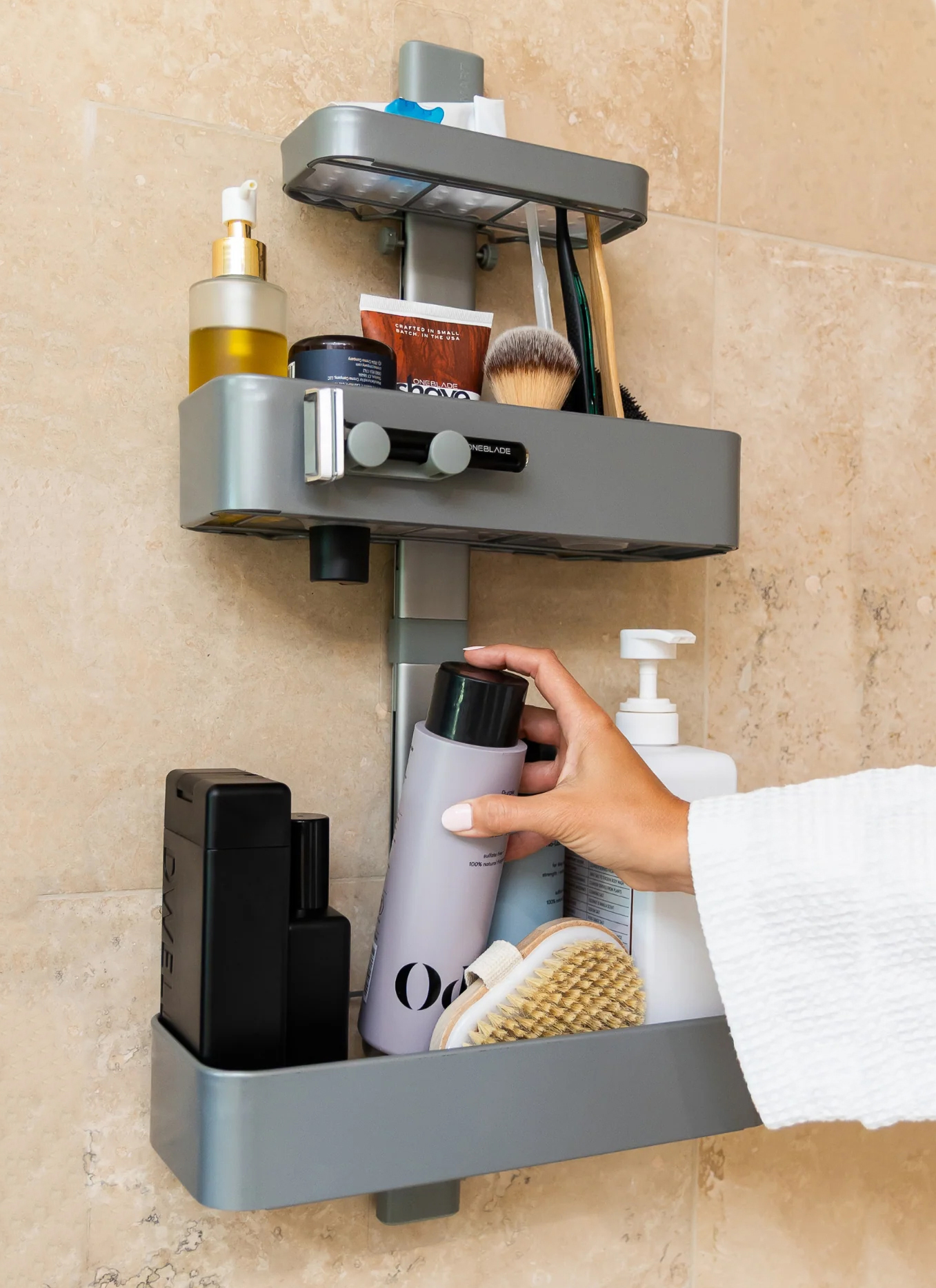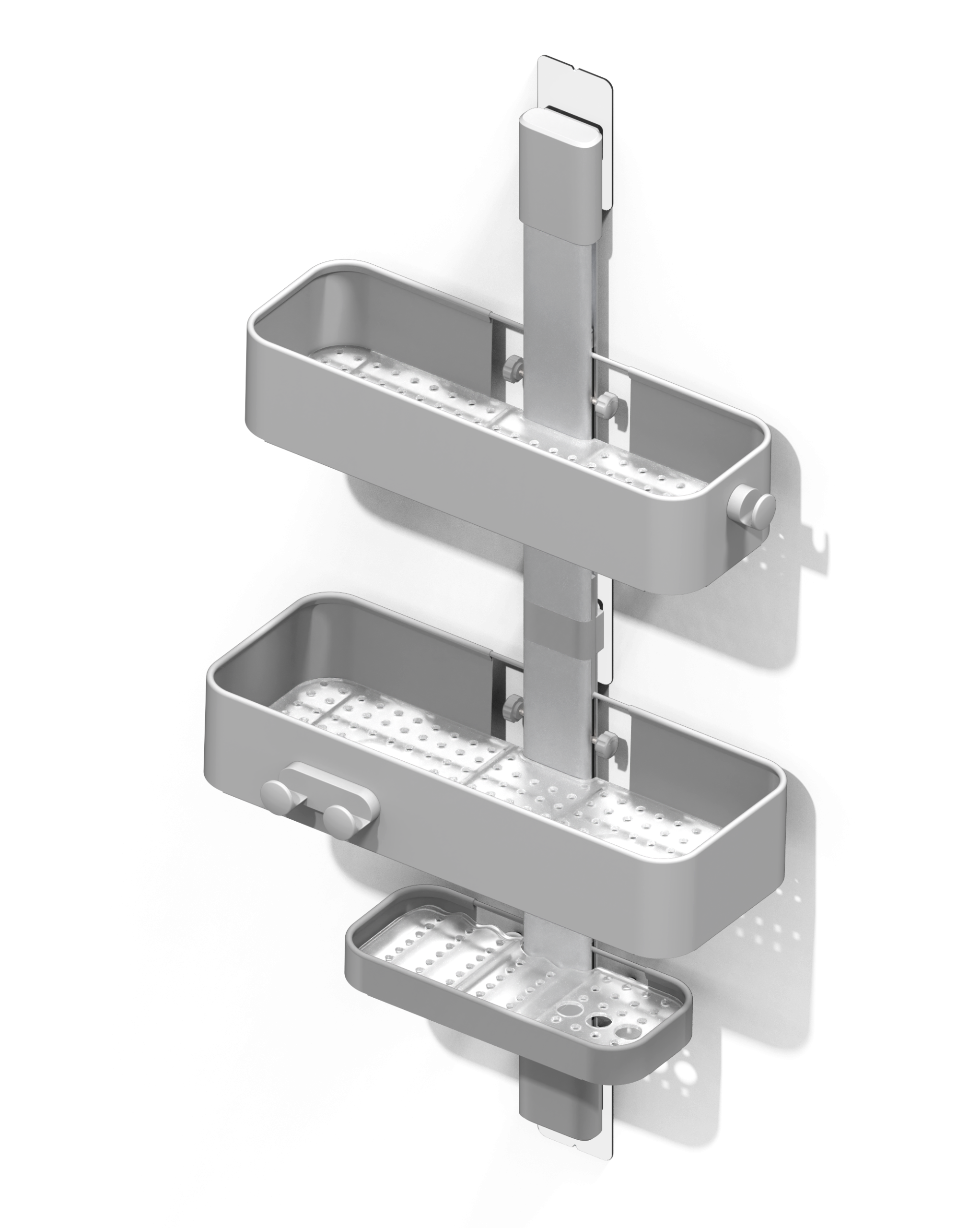 ShowerSMART was designed to blend into the modern bathroom environment with simple forms and clean surfaces, while maximizing storage and organization for customers. Storage bins are sized to accommodate a full range of container sizes, while magnetically mounted hooks are freely positioned to hold razors, brushes, and loofas. Fasteners are easily accessible during assembly and installation but are hidden from view once installed.