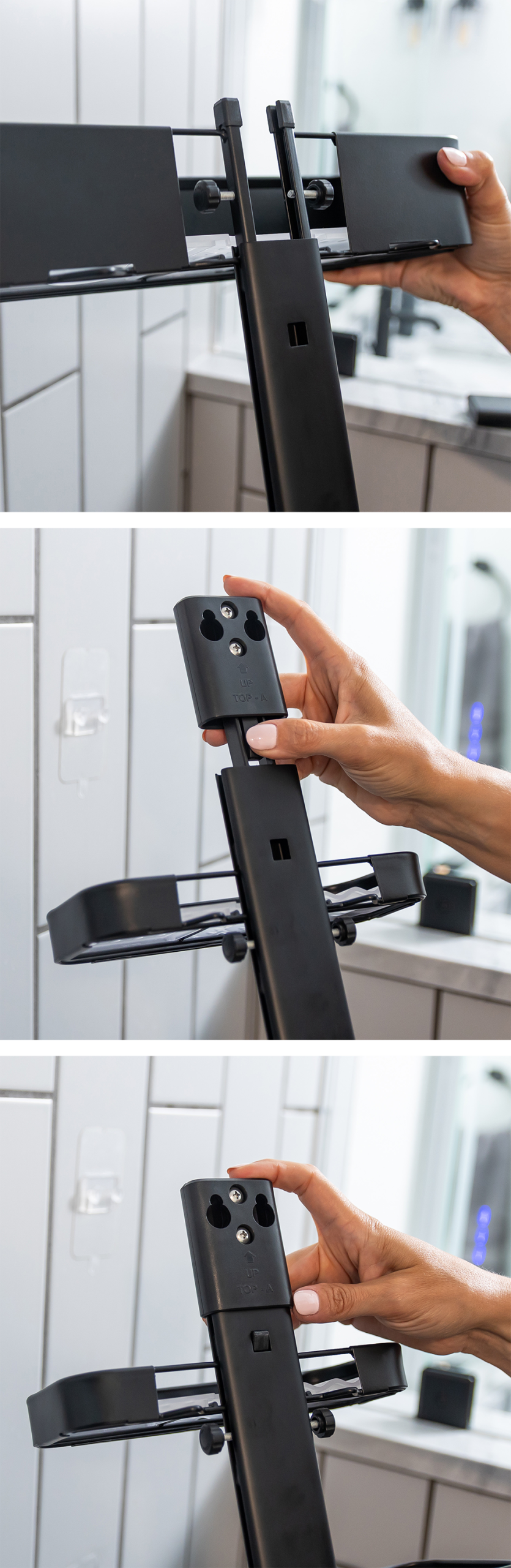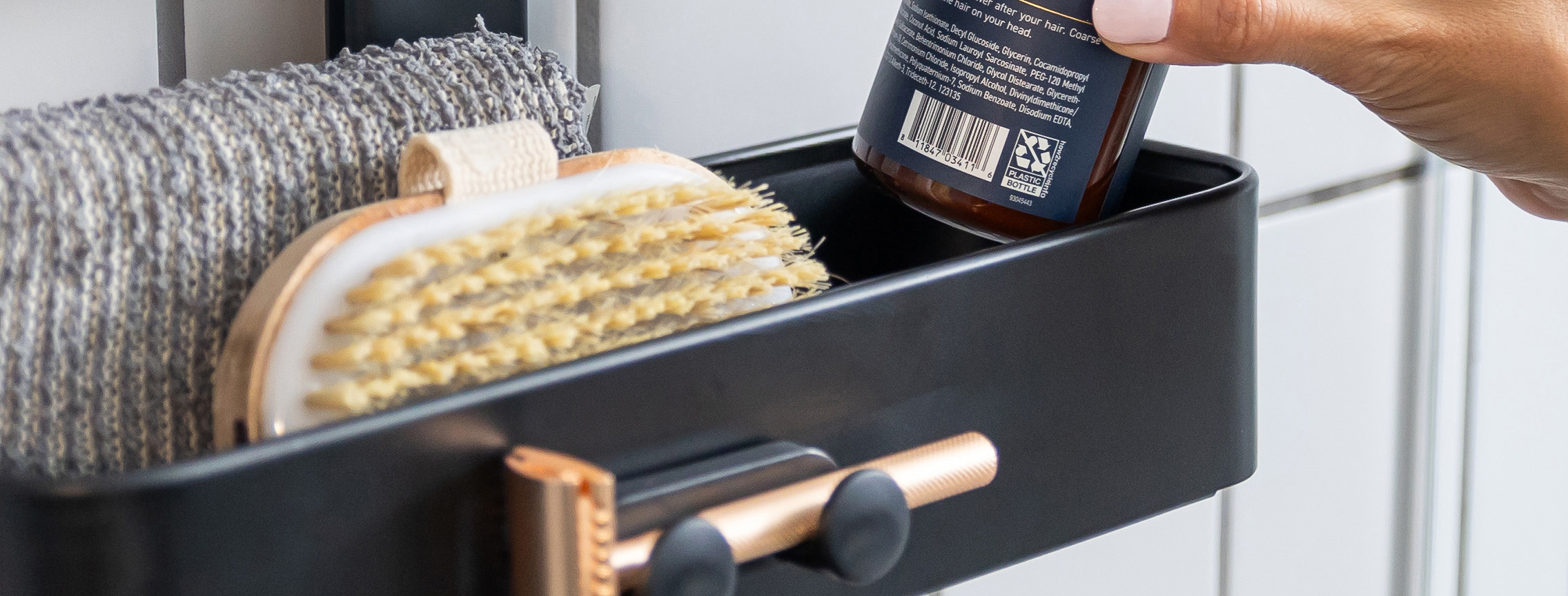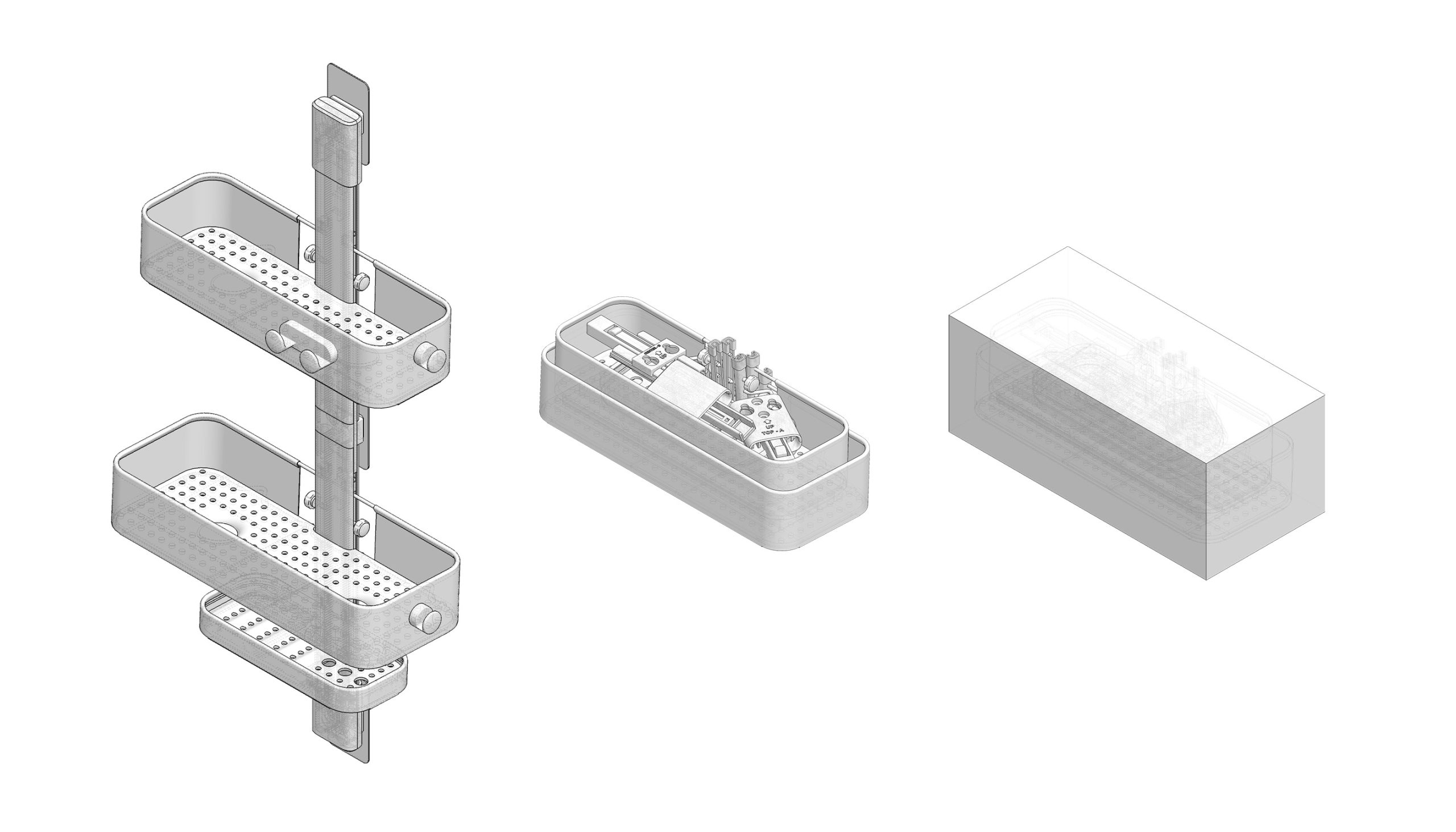 ShowerSMART was designed to blend into the modern bathroom environment with simple forms and clean surfaces, while maximizing storage and organization for customers. Storage bins are sized to accommodate a full range of container sizes, while magnetically mounted hooks are freely positioned to hold razors, brushes, and loofas. Fasteners are easily accessible during assembly and installation but are hidden from view once installed.